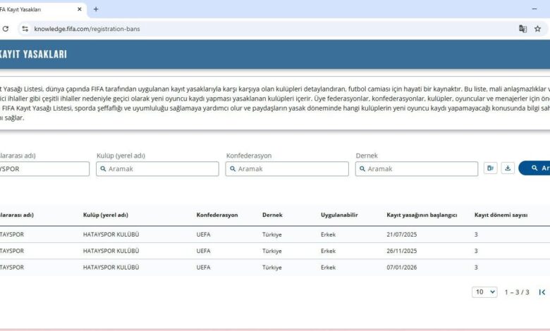 FIFA, Hatayspor’a 3 dönem daha transfer yasağı getirdi. Bu kararla birlikte kulübün toplam transfer yasağı 9 döneme çıktı.